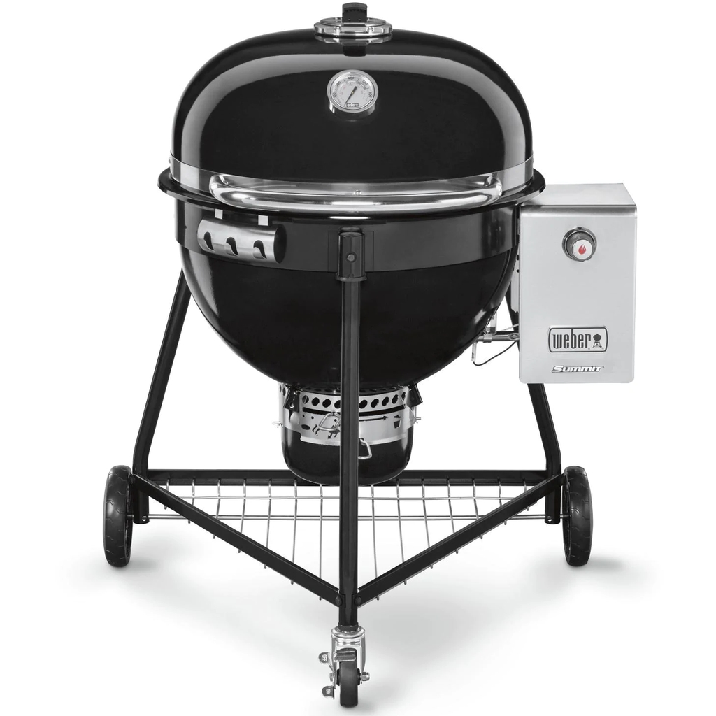 Taking the classic design of the Weber kettle grill and making it bigger and bolder in every way, the Weber Summit Charcoal is designed to make backyard grilling and smoking more easy and convenient. Made of premium-grade U. S. Steel coated with porcelain enamel inside and out, the Summit Charcoal grill features a double walled bowl and lid. Air is trapped between the double walls and acts as an insulator, retaining heat and keeping the temperature consistent for up to 12 hours on a single load of charcoal. In addition, the air insulated design allows the grill to respond to temperature adjustments much faster than grills made from ceramic. The 24-inch stainless steel cooking grate offers 452 square inches of cooking space, so you can cook for the whole family easily. The Summit Charcoal grill also features the Gourmet BBQ System hinged cooking grate with a 12-inch insert that can be replaced with other components (sold separately) such as a wok or pizza stone, allowing you to cook a wider variety of food on the grill. The Snap-Jet gas ignition system runs off a 16 ounce propane cylinder so you can start the fire with a gas flame and be ready to cook in 15 minutes. With the two position charcoal grate, you can set the grate low for smoking or high for high searing heat. For more improved cooking at low temperature, place the stainless steel hinged heat diffuser plate just above the coals. The plate deflects heat away from food, keeping the consistently low. The plate is also hinged so you can add more charcoal or wood if needed. The Summit Charcoal is designed to take the guesswork out of perfecting the airflow during cooking. Three bottom vent positions make it easy to dial in the right amount of air. Use the smoke setting to minimize the airflow, or open up the vent wide for searing with high heat. The RapidFire lid damper features a hinged design, so you can open it up for maximum airflow or adjust it side to side to dial in more precise temperatures. Although the lid is not as heavy as a ceramic kamado, the Summit Charcoal includes a heavy-duty, easy open lid hinge makes opening the lid nearly effortless. The lid also features a braided stainless steel gasket which seals the lid and the bowl, holding heat inside like a vacuum. The One-Touch cleaning system makes clean-up hassle free. As you rotate the handle, three blades in the bowl move ash through the vents and down into the removable, high-capacity aluminum ash catcher below, which is enclosed to prevent ashes from blowing away and creating a mess. The heavy-duty steel cart features casters for easy mobility and tool hooks for storing your BBQ tools.