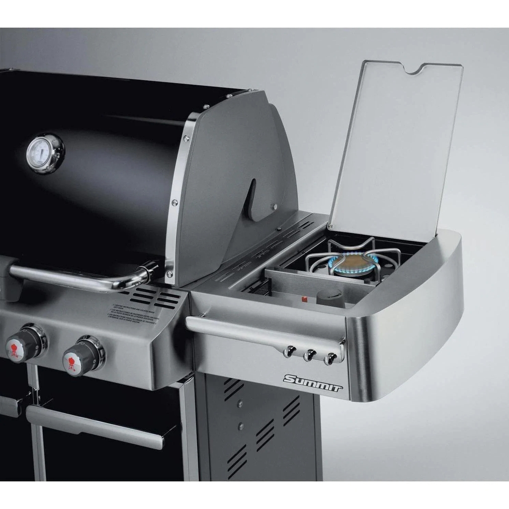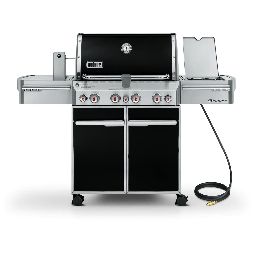 Summit Series gas BBQ grills are the crown jewels of the Weber family, with exclusive features, the highest level of performance and stunning looks. The Weber Summit E-470 is beauty redefined, but it adds more than just style to your backyard. The porcelain-enameled E-470 features 4 stainless steel burners that produce 48,800 BTUs and a 10,600 BTU Sear Station, each with Snap-Jet individual burner ignition to help you get the party started as quickly as possible. The Summit E series natural gas grill comes fully equipped with 9mm (3/8 inch) stainless steel rod cooking grates and stainless steel Flavorizer bars to effectively hold and distribute heat evenly over the 468 square-inch main cooking grid. The warming rack provides an additional 112 square inches for a generous 580 square inches of total cooking area. Summit grills come equipped with a stainless steel grease tray with a catch pan to make clean-up as easy as possible. This Weber E-470 also has a 12,000 BTU flush-mounted side burner that lets you multi-task while grilling, a stainless steel smoker box with a dedicated 6,800 BTU smoker burner and a 10,600 BTU infrared rotisserie rear burner. The Tuck-Away rotisserie system features a flip-up motor and separate spit rod and fork storage inside the cart. This Weber Summit grill has a porcelain-enameled frame and lid and a front-mounted control panel with LED lighted control knobs. The attractive black hood has a polished handle and trim and a center-mounted thermometer to monitor cooking temperatures. The grill cart features an enclosed storage area and four heavy-duty casters (2 locking and 2 swivel). Two stainless steel side shelves provide expansive prep space and six convenient built-in tool hooks keep your BBQ tools nearby. Light up your grill with the Grill Out handle light, which features an integrated tilt sensor that automatically turns the light on when the lid is raised and off when the lid is closed. A 10-foot flexible natural gas hose is included. With the Weber Summit E-470, welcome to the top-of-the-line! Please note, the grill height dimension listed in the specifications are with the grill lid open. Please note this Weber grill cannot be converted to run on a different fuel type. Be careful when selecting the fuel type desired.