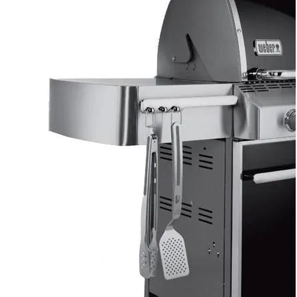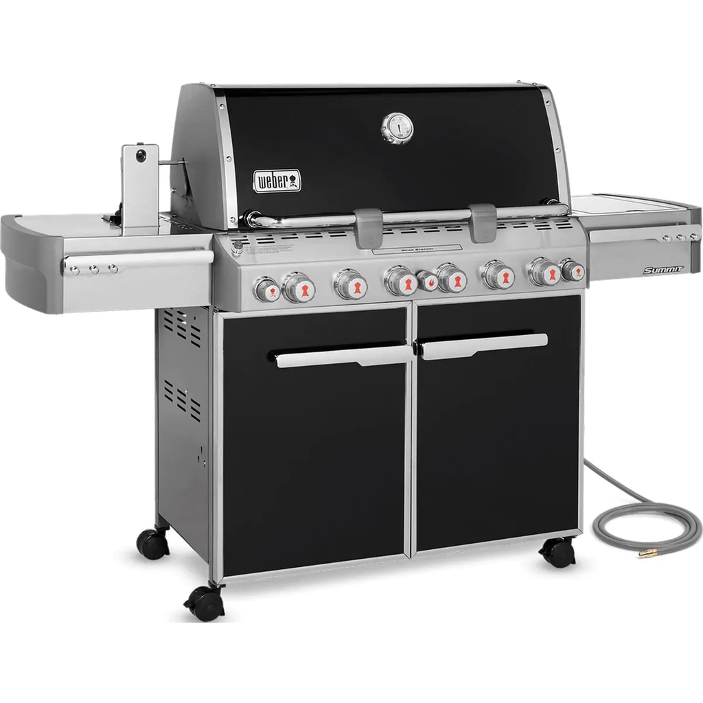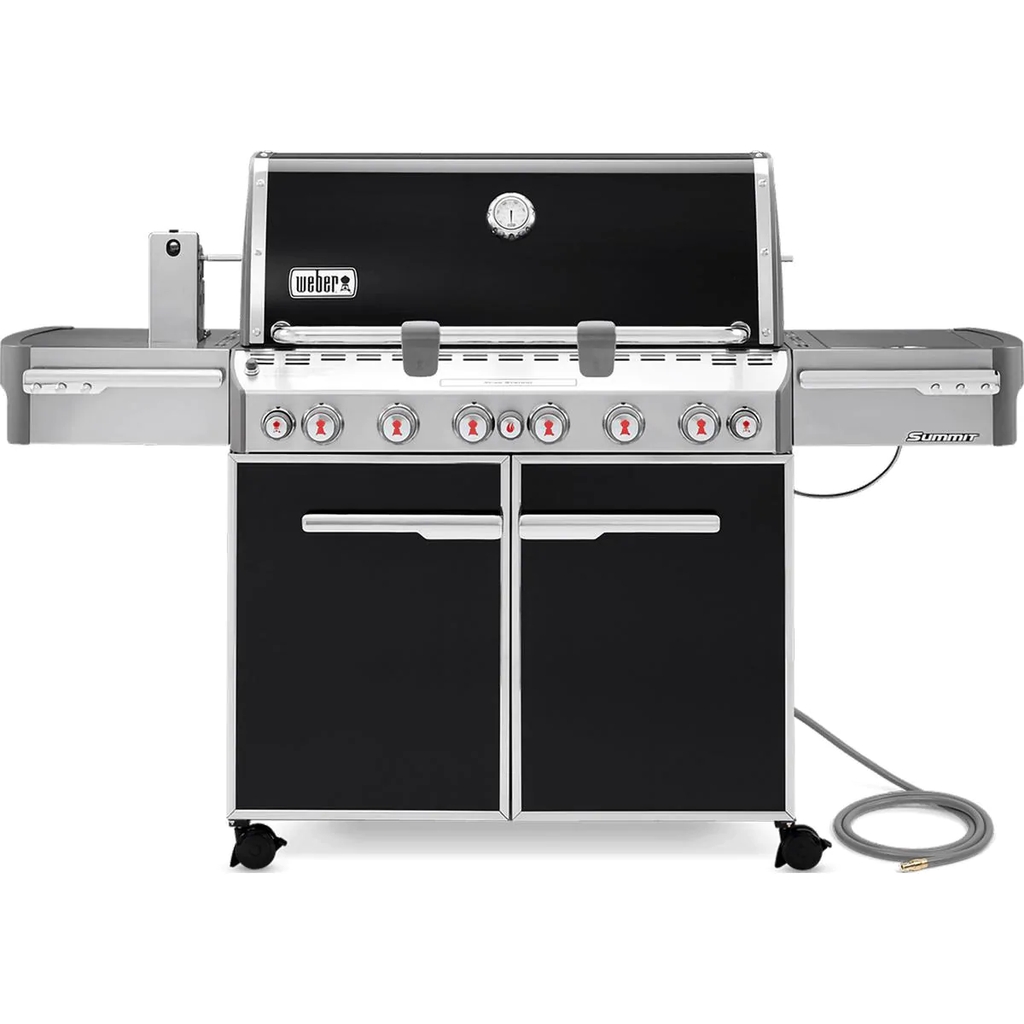 Summit Series gas BBQ grills are the crown jewels of the Weber family, with exclusive features, the highest level of performance and stunning looks. Weber packed all of their top features into this dramatic looking Summit E-670 grill, but it adds more than just style to your backyard. The porcelain-enameled E-670 features 6 stainless steel burners that produce 60,000 BTUs and a 10,600 BTU Sear Station, each with Snap-Jet individual burner ignition to help you get the party started as quickly as possible. The Summit E series natural gas grill comes fully equipped with 9mm (3/8 inch) stainless steel rod cooking grates and stainless steel Flavorizer bars to effectively hold and distribute heat evenly over the 624 square-inch main cooking grid. The warming rack provides an additional 145 square inches for a huge 769 square inches of total cooking area. Summit grills come equipped with a stainless steel grease tray with a catch pan to make clean-up as easy as possible. This Weber E-670 also has a 12,000 BTU flush-mounted side burner that lets you multi-task while grilling, a stainless steel smoker box with a dedicated 6,800 BTU smoker burner and a 10,600 BTU infrared rotisserie rear burner. The Tuck-Away rotisserie system features a flip-up motor and separate spit rod and fork storage inside the cart. This Weber Summit grill has a painted steel frame and a front-mounted control panel with LED lighted control knobs. The black porcelain-enameled hood has a polished handle and trim and a center-mounted thermometer to monitor cooking temperatures. The grill cart features an enclosed storage area and four heavy-duty casters (2 locking and 2 swivel). Two stainless steel side shelves with painted cast aluminum end caps provide expansive prep space and six convenient built-in tool hooks keep your BBQ tools nearby. Light up your grill with two Grill Out handle lights, which feature an integrated tilt sensor that automatically turns the lights on when the lid is raised and off when the lid is closed. A 10-foot flexible natural gas hose is included. With the Weber Summit E-670, welcome to the top-of-the-line! Please note, the grill height dimension listed in the specifications are with the grill lid open. Please note this Weber grill cannot be converted to run on a different fuel type. Be careful when selecting the fuel type desired.