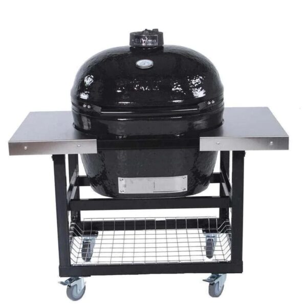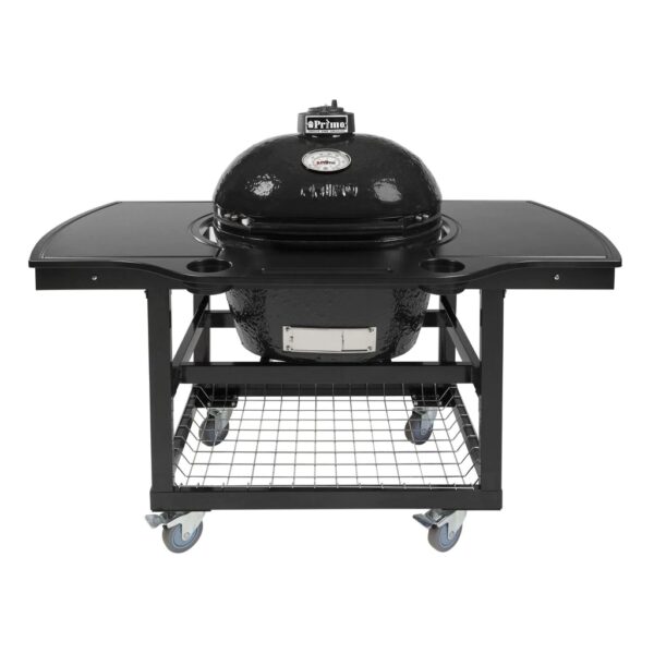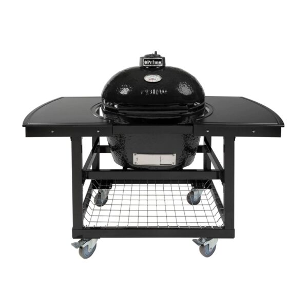 Primo Oval Large 300 Ceramic Kamado Grill On Steel Cart With 2-Piece Island Side Shelves And Stainless Steel Grates – 775